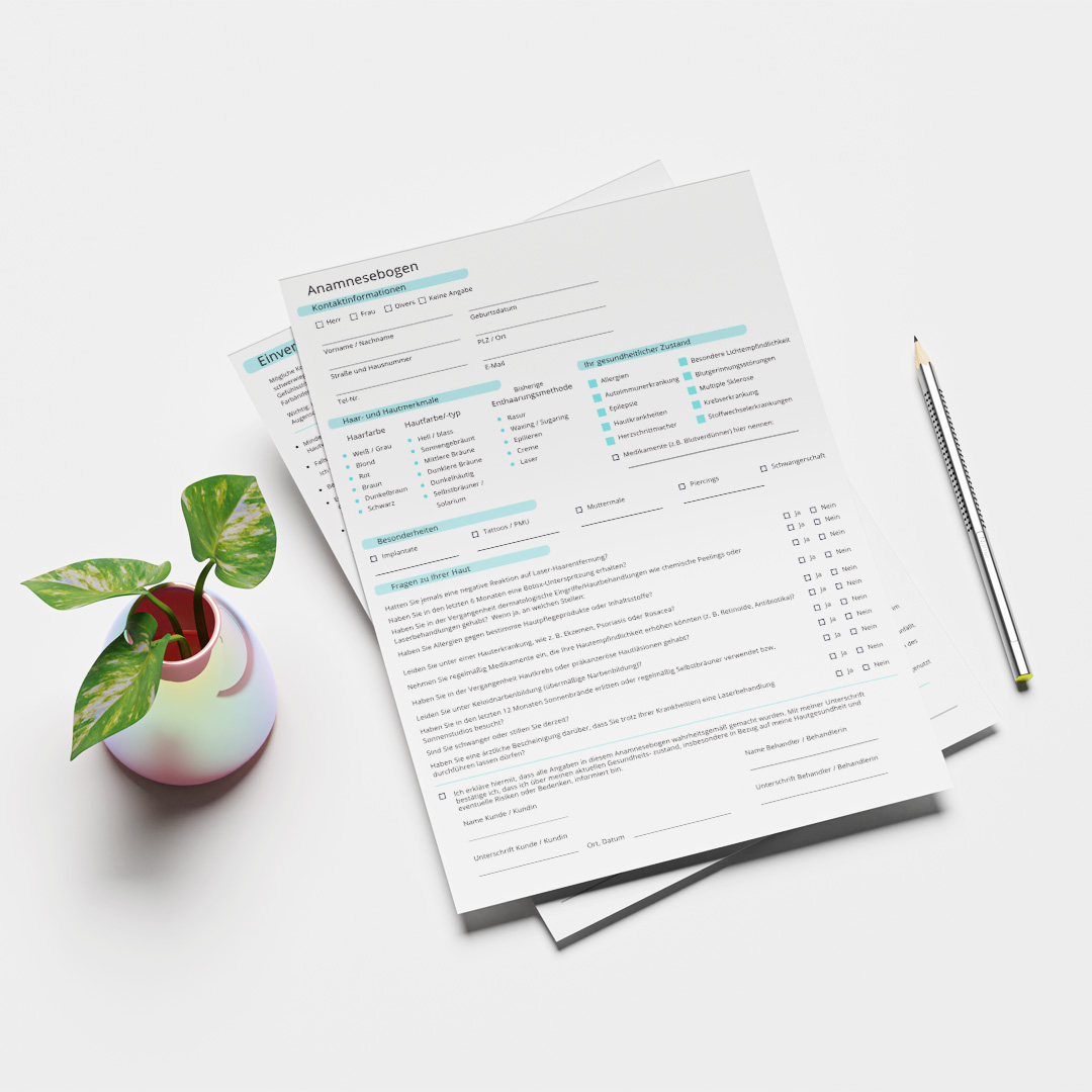 • Anamnesebogen & Einverständniserklärung (zweiseitig) für den digitalen Download und zum Selbstdrucken